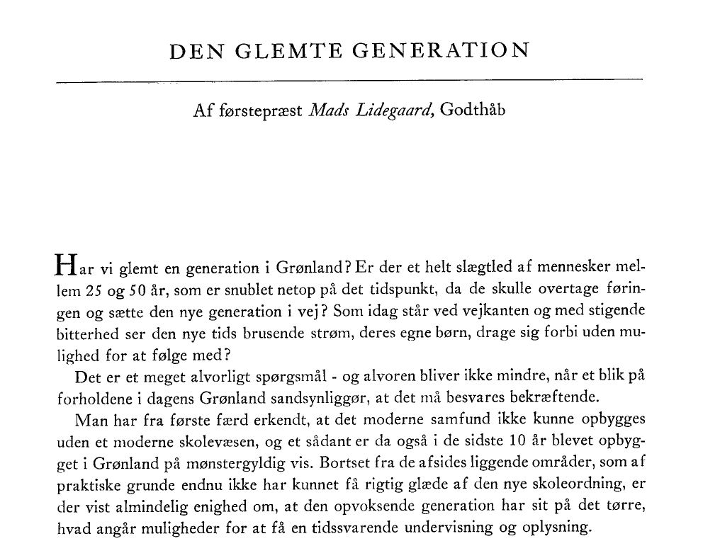 ”Det er umuligt at bevise, hvor mange af den nye tids meget omtalte samfundsproblemer, som findes i den glemte generation og dens måde at opføre sig på. Men det er tydeligt, mange har svært ved at klare de udfordringer, som den nye tid giver, og som får moralen til at bryde sammen. Det viser sig i kønslig holdningsløshed, umådeholdent drikkeri, stigende kriminalitet, og hvad man ellers jamrer sig over i nutidens Grønland.”